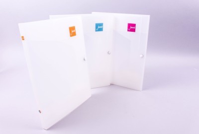Creased & die cut to shape. Outside litho printed with a white base, 4 colour process + overall seal.